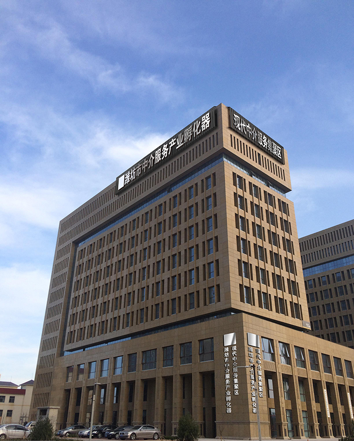 潍坊市现代中介服务业孵化器坐落于潍坊国家高新技术产业开发区金融广场10号办公综合楼,建筑面积16,000平方米。以“立足潍坊,面向全省,辐射环渤海经济圈”为战略目标,以金融中介为重点,以全产业链为特色,形成集聚、孵化融合互通,带动行业诚信、规范发展,更好地为实体经济提供优质、高效、一条龙的专业化、国际化、高端化服务,打造互联网时代全国领先的、全产业链的现代中介服务业创新服务平台。