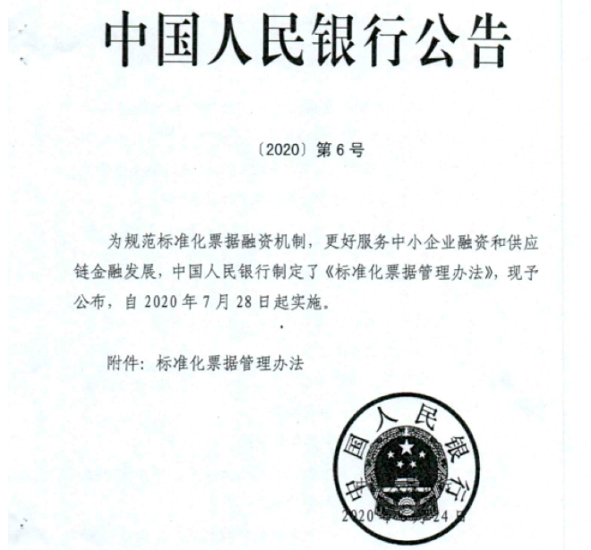 为规范标准化票据融资机制,更好服务中小企业融资和供应链金融发展,中国人民银行制定了《标准化票据管理办法》,现予公布,自2020年7月28日起实施。